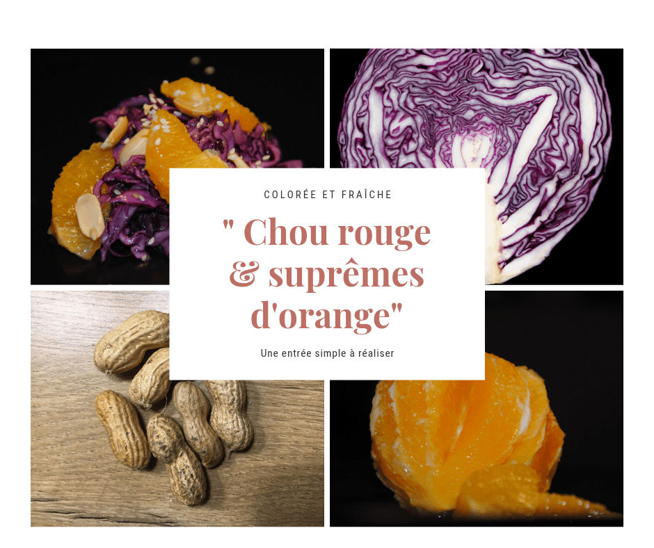 Cette entrée est à coup sûr fraîche et colorée. Elle s’effectue rapidement à l’aide d’une mandoline pour couper le 1/2 chou rouge, ainsi que d’un couteau très affuté pour tailler les suprêmes d’orange . Il suffit d’éplucher l’orange et de découper chaque quartier d’orange entre chaque membrane.