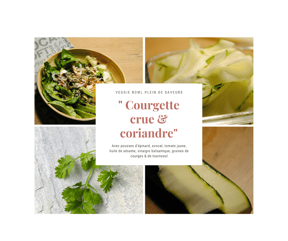 Formidable mariage pour le plein de saveurs ! Il vous suffit de réaliser des rubans de courgette (bio, puisque j’ai conservé la peau) grâce à un économe, de les mêler à des feuilles de coriandre, et d’assaisonner avec de l’huile de sésame, du vinaigre balsamique et du sel. C’est d’une facilité déconcertante :-), servis avec des pousses d’épinards, de l’avocat, de la tomate jaunes, des graines de tournesol et de courge torréfiées, et un soupçon d’oignon rouge frais.