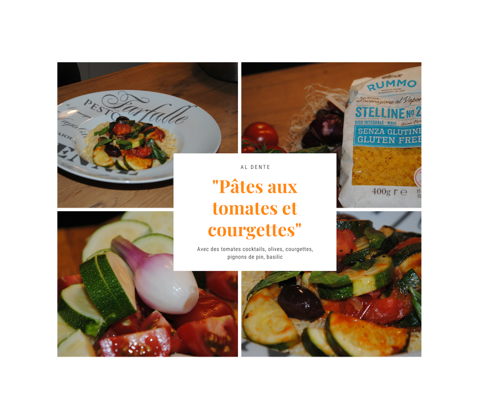 Pendant la cuisson des pâtes que vous avez jetées dans de l’eau salée, vous préparez les légumes : des tomates cocktail coupées en 4, de la courgette coupée en morceaux, un oignon rouge frais, des olives Kalamata, des pignons de pin, un peu d’ail dans un filet d’huile d’olive. Vous salez poivrez, laisser mijoter une dizaine de minutes, c’est prêt… reste à ajouter le basilic et si vous le souhaitez du parmesan.