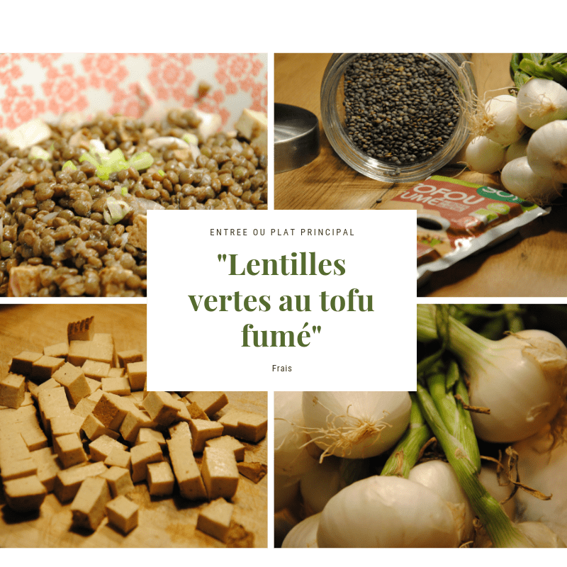 Les lentilles vertes sont plongées dans l’eau bouillante agrémentée d’un bouquet garni et de sel pour 30 Minutes de cuisson. Lentilles vertes, tofu fumé et oignon frais composent les 3 ingrédients principaux pour cette salade. Une fois les lentilles refroidies, le tofu ferme fumé et les oignons sont ajoutés coupés en dés avec une vinaigrette relevée, huile d’olive, vinaigre de banyuls, moutarde, sel et poivre. c’est prêt !